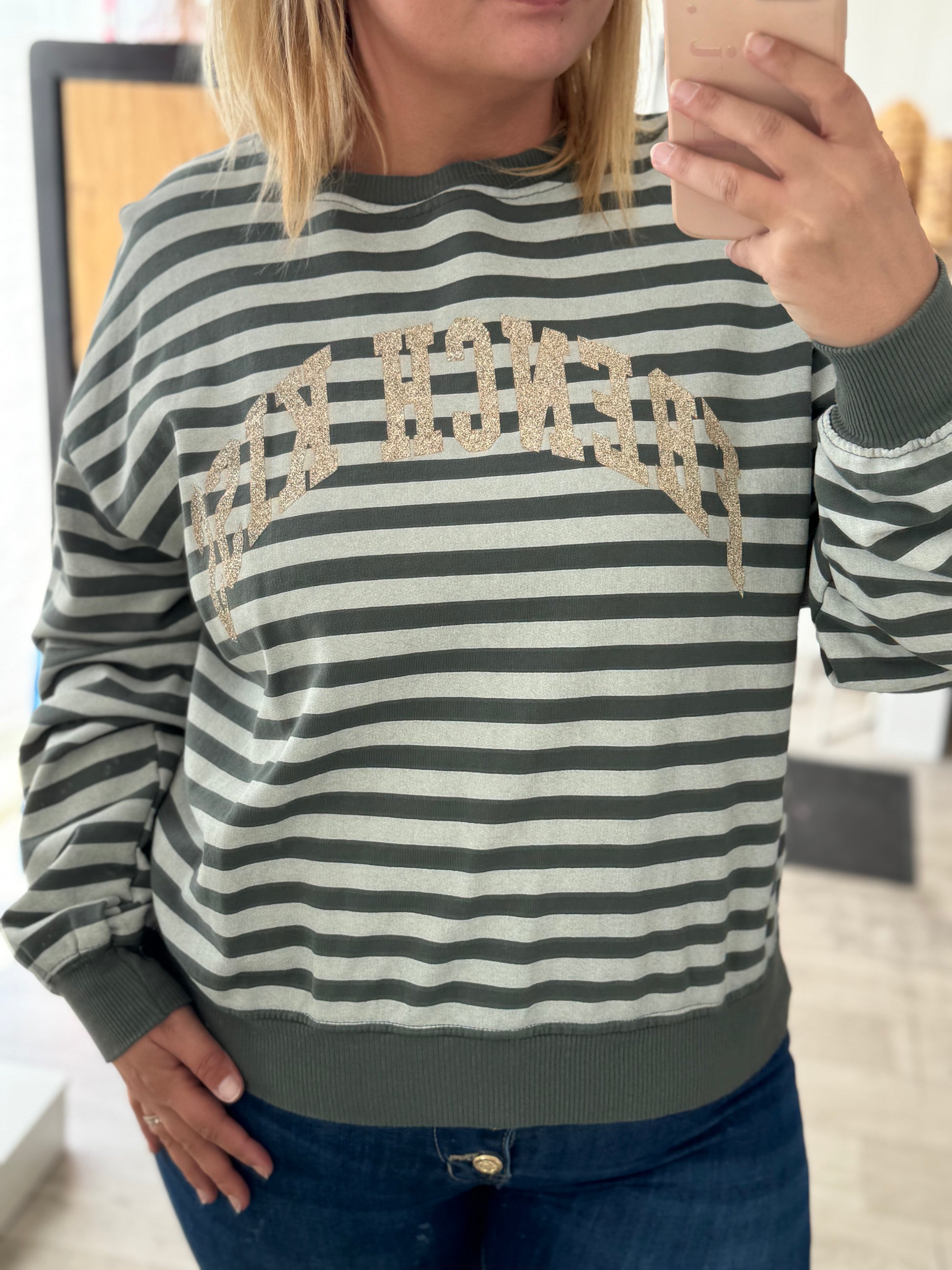 Sweat femme rayé vert kaki avec écriture dorée – Taille unique 34-44